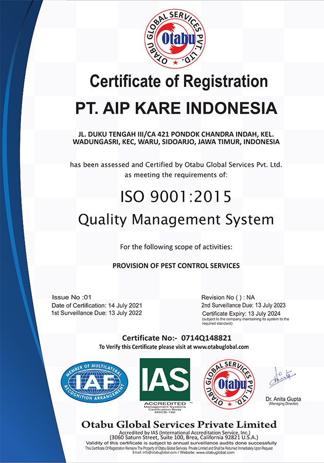 PT. AIP KARE INDONESIA adalah perusahaan pest management yang berdiri sejak tahun 2012. Perusahaan Pest Management yang bergerak di bidang pengendalian hama seperti tikus, kecoa, semut, rayap dan semua binatang pengganggu yang hidup di sekitar tempat tinggal, area perkantoran, restoran maupun di area industri manufacture.